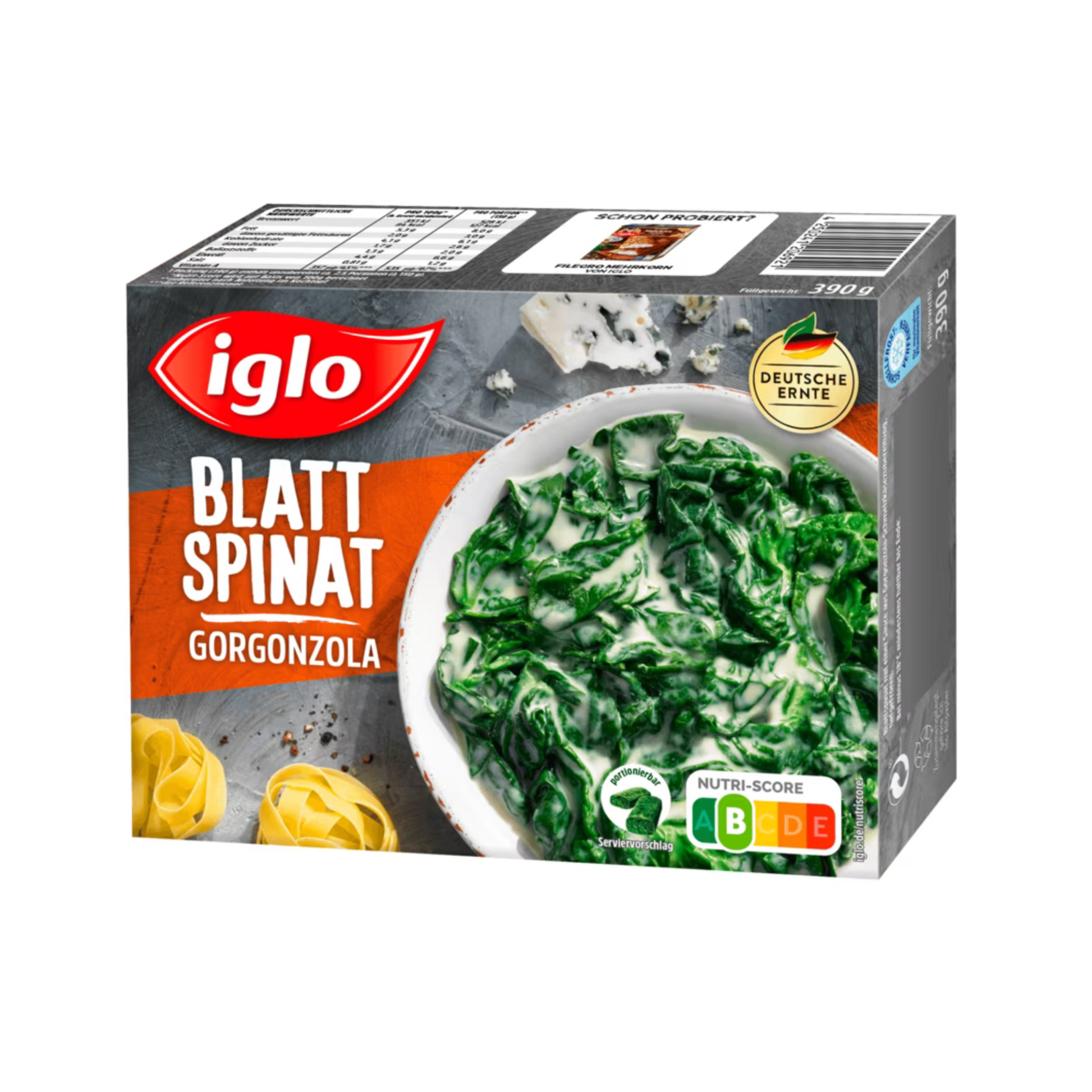 Blattspinat, fettarme Milch, Gorgonzola-Schmelzkäsezubereitung, Wasser, Rapsöl, Stärke, Weizenmehl, Vollmilchpulver, Salz, Gemüsebrühe, Gewürze